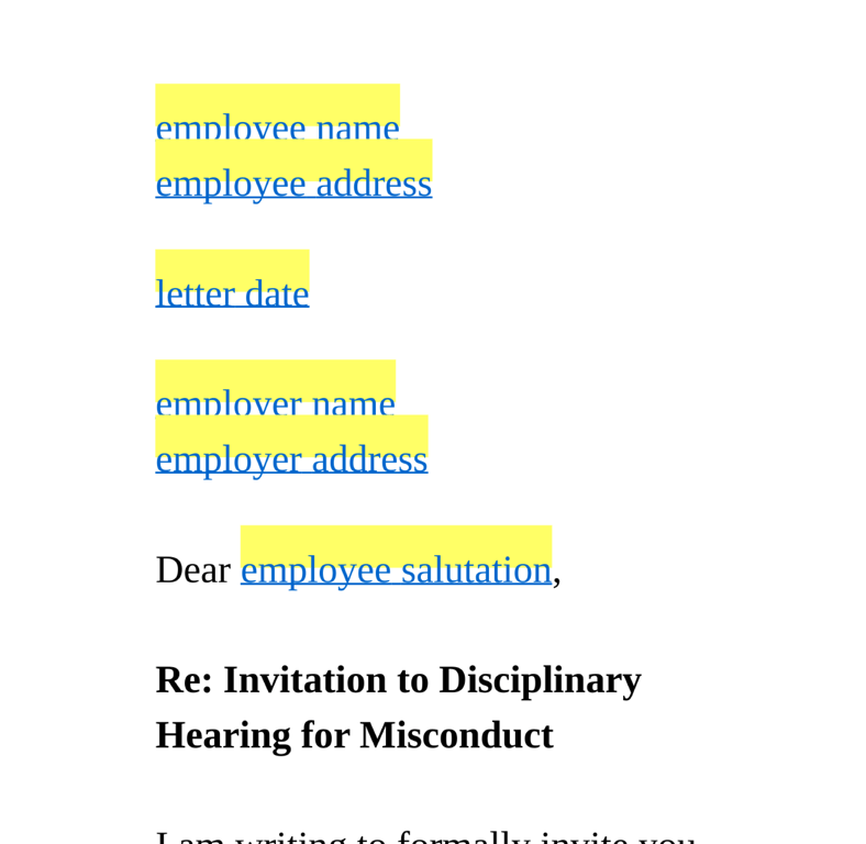 The letter also explains the potential consequences of the hearing, which might range from a formal warning to dismissal depending on the severity of the misconduct. It emphasizes the importance of the employee's attendance and cooperation in resolving the issue.